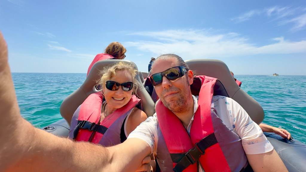 Our holiday doesn’t properly start until Sarah has her feet on the beach!My lovely Wife Sarah at Vilamoura marina, Portugal.Me & Sarah sat at the front of the RIB boat on our tour of the Benagil caves!Wow a dolphin! 😲