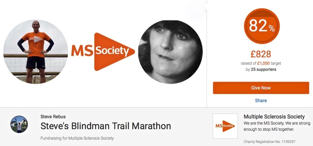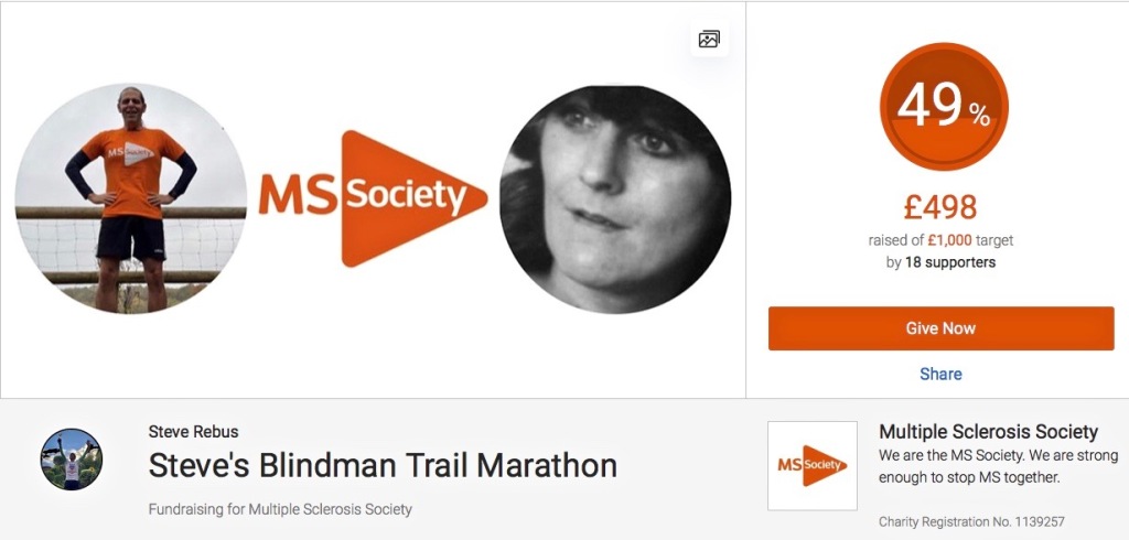 Steveβs Blindman Trail Marathon Fundraising for Multiple Sclerosis SocietyIn Memory of my mum Valerie. Donβt underestimate the impact of the money you are donating! Itβs so important and it really does make a difference; today, tomorrow and for generations to comeβ¦β€οΈ